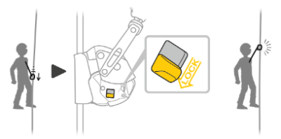 • Fonction de blocage intégrée à l’antichute permettant à l’utilisateur d’immobiliser l’appareil pour réduire la hauteur de chute. En cas de grand vent, cette fonction évite également à la corde d’être tirée vers le haut.