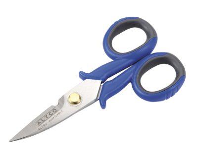 Ciseaux d’électricien polyvalents en inox. Longueur totale de 14,5 cm. Longueur des tranchants de 5 cm.