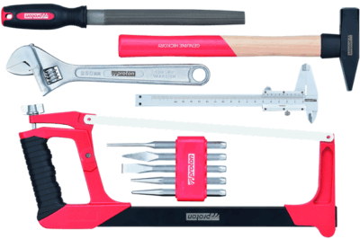 - 1 jeu d'outils 5 pcs. 1 poinçon 120 mm, 1 poinçon 120 mm, 1 burin plat 130 mm, 1 burin croisé 130 mm, 1 chasse-goupille 150 mm