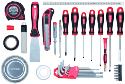 - Mallette à outils bien équipée pour chaque application. Coffret robuste en ABS avec tournevis, pinces, clés mixtes, clé à molette, cliquets avec douilles 6 pans, scie à métaux, etc.