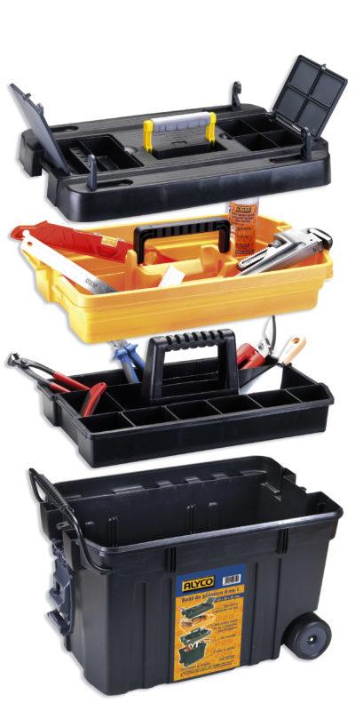 Le conteneur principal comprend 2 plateaux avec poignée, qui peuvent être séparés du conteneur et s’adapter parfaitement à l’intérieur de la boîte. Ces plateaux conviennent aux petits outils et aux consommables. Ils permettent une bonne organisation de la boîte.