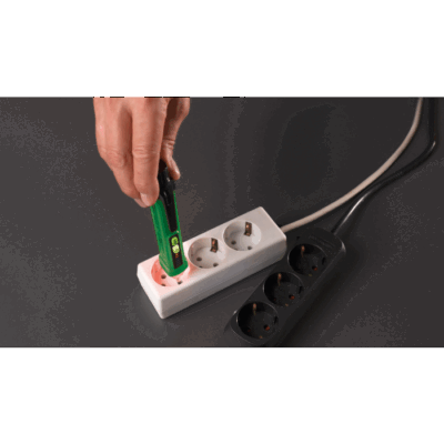 Le testeur de tension permet de détecter sans contact les tensions alternatives dans une plage de 12 à 1000 volts. Le contrôle de la tension s’effectue sans contact et est signalé par un affichage LED à trois niveaux ainsi que par un signal acoustique. Une lampe de poche à LED intégrée facilite l’utilisation même dans des conditions de faible luminosité. L’appareil est entièrement isolé, ce qui rend tout contact métallique inutile pour le contrôle. Une touche de mise en marche avec affichage intégré de l’état des piles renseigne sur l’état actuel de l’énergie. La fonction d’arrêt automatique permet de prolonger la durée de vie des piles. Le testeur de tension convient au contrôle des phases, à la recherche de câbles sous tension, à la localisation de points de rupture dans les câbles et à la détection d’ampoules défectueuses dans les guirlandes lumineuses. L’appareil correspond à la catégorie de mesure CAT III jusqu’à 1000 volts et fonctionne avec deux piles AAA.