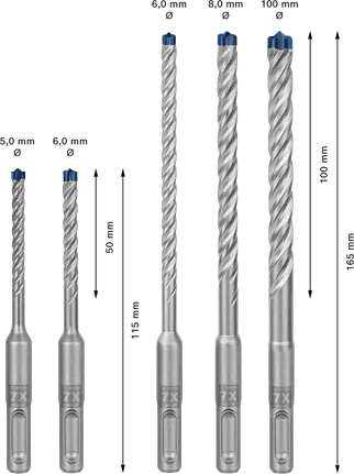 Jeu de 7 forets pour perforateur EXPERT SDS plus-7X, 5/6/6/8/8/10/12 mm