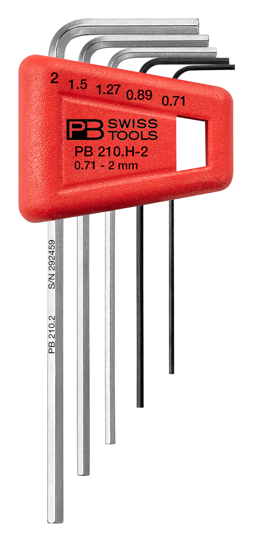 Les clés mâles coudées PB Swiss Tools pour vis à 6 pans (mm) trouvent leur application à travers le monde entier dans les domaines de la construction mécanique et métallique ainsi que dans l’industrie automobile. Les professionnels choisissent leurs outils parmi la large gamme allant de 0.71 à 22 mm. Le respect des olérances pas plus grandes qu’un cheveu est garantit pour chaque clé mâle coudée. Cette qualité dimensionnelle parfaite et l’alliage spécial résistant garantissent des outils précis et durables. Les clés mâles coudées pour vis à 6 pans sont livrables en exécution chromée, avec un revêtement par poudre et code de couleurs. La multitude de clés mâles coudées avec ou sans tête sphérique ne laisse aucune question sans réponse.