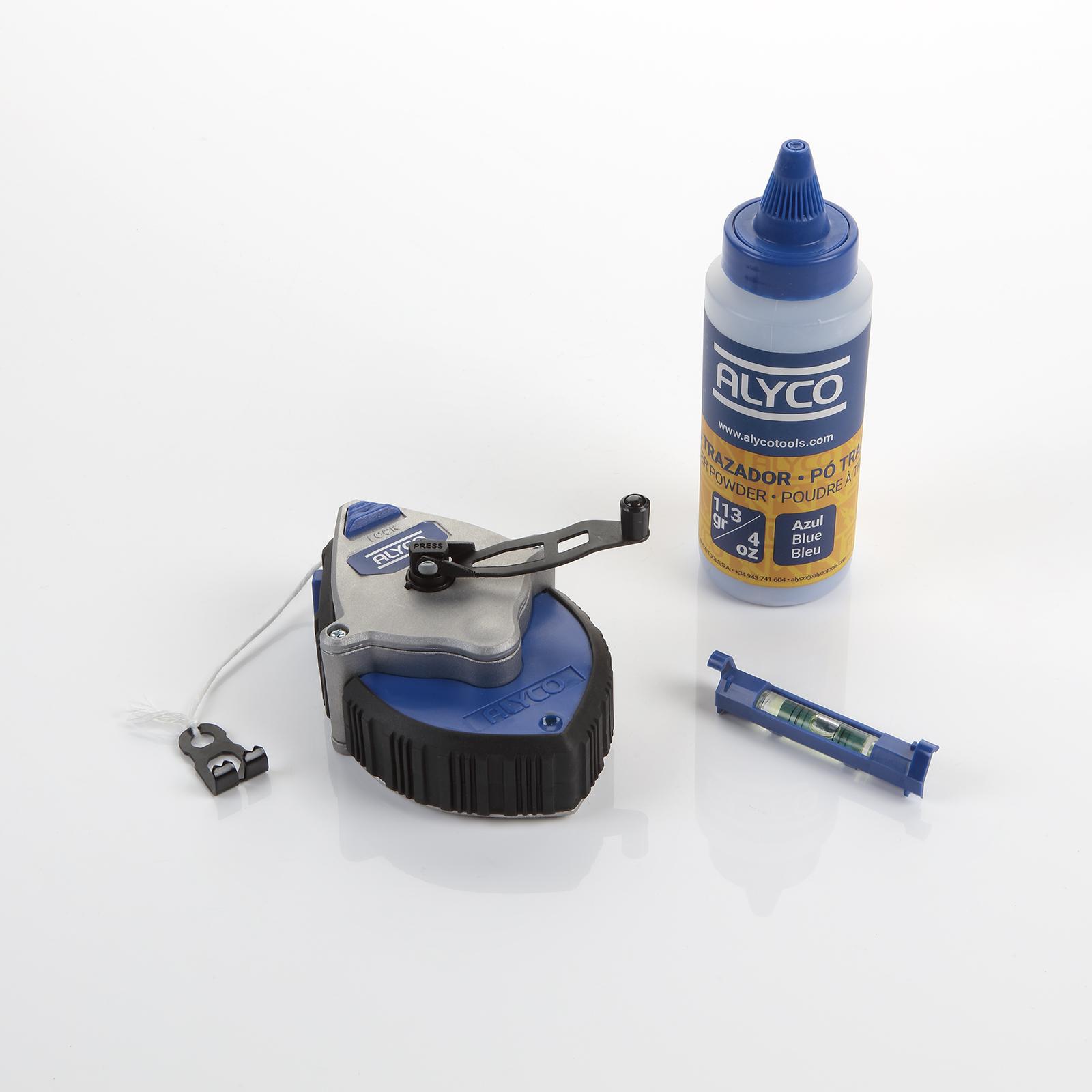 Jeu de cordeau traceur, bidon de poudre et niveau à bulle