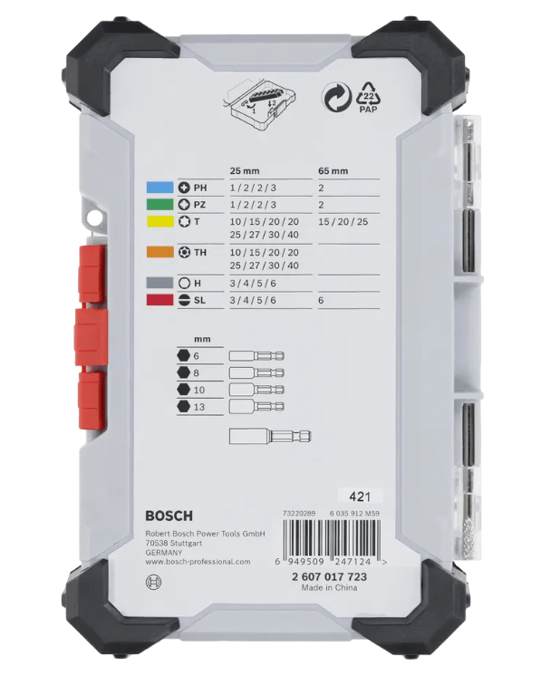PH1 ; PH2 (2x) ; PH3 ; PZ1 ; PZ2 (2x) ; PZ3 ; T10 ; T15 ; T20 (2x) ; T25 ; T27 ; T30 ; T40 ; T10H ; T15H ; T20H (2x) ; T25H ; T27H ; T30H ; T40H ; H3 ; H4 ; H5 ; H6 ; SL3 ; SL4 ; SL5 ; SL6. Embout de vissage de 65 mm : PH2 ; PZ2 ; T15 ; T20 ; T25 ; SL6. Douille 50 mm : 6 ; 8 ; 10 ; 13 mm. Porte-embout de 55 mm : Porte-embout Standard.