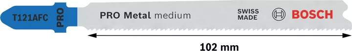 • La lame de scie sauteuse PRO Metal medium T121AFC est fabriquée en bimétal : elle est dotée d’une denture progressive en acier rapide (HSS) avec un revêtement au nitrure d’aluminium-titane (AlTiN) qui est liée à un corps en acier à haute teneur en carbone (HCS) pour plus de résistance et de durabilité. La géométrie de la denture, avec ses dents robustes et ondulées, le corps conique de la lame et son trait de coupe fin garantissent une progression de coupe en douceur. Vous pouvez l’utiliser pour découper des tôles moyennes à fines d’une épaisseur comprise entre 1 et 3 mm.