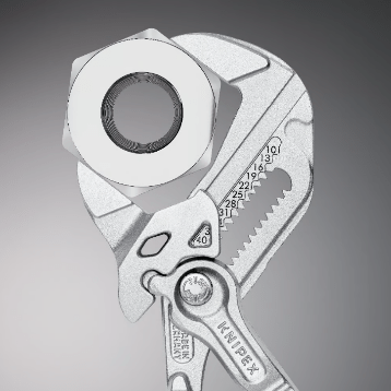La pince-clé combine de nombreuses fonctions : elle remplace tout un jeu de clés de tailles métriques et en pouces, peut être ajustée très rapidement et directement sur la pièce à travailler par simple pression d'un bouton et elle peut manipuler toutes les largeurs de clés jusqu'à 40 mm grâce à un réglage de la préhension quasiment infini. L'axe d'articulation s'enclenche en toute sécurité, empêchant tout déréglage accidentel. Les mâchoires de préhension lisses sont parallèles et agrippent la pièce sans endommager les bords ou les surfaces sensibles, ménageant les robinetteries chromées au montage !