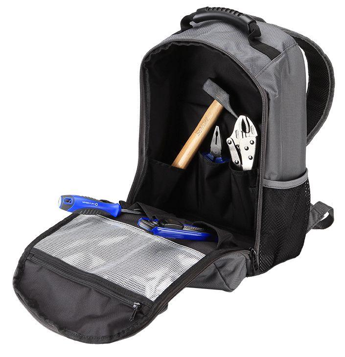 Sac à dos en nylon avec 3 poches et deux compartiments latéraux. À l’intérieur, il comporte plusieurs compartiments pour des outils, un ordinateur portable et des documents. Deux bretelles larges et rembourrées. Poignée sur le dessus, renforcée et rembourrée. Base en plastique rigide et étanche.