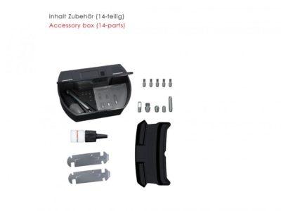 - La sécurité automatique contre le recul empêche la tige en fibre de verre de glisser involontairement dans la boîte. La boîte s'ouvre avec une seule vis à l'arrière pour les travaux de maintenance. Cela permet également de retirer la boîte d'accessoires intégrée, qui contient un jeu de 14 accessoires.